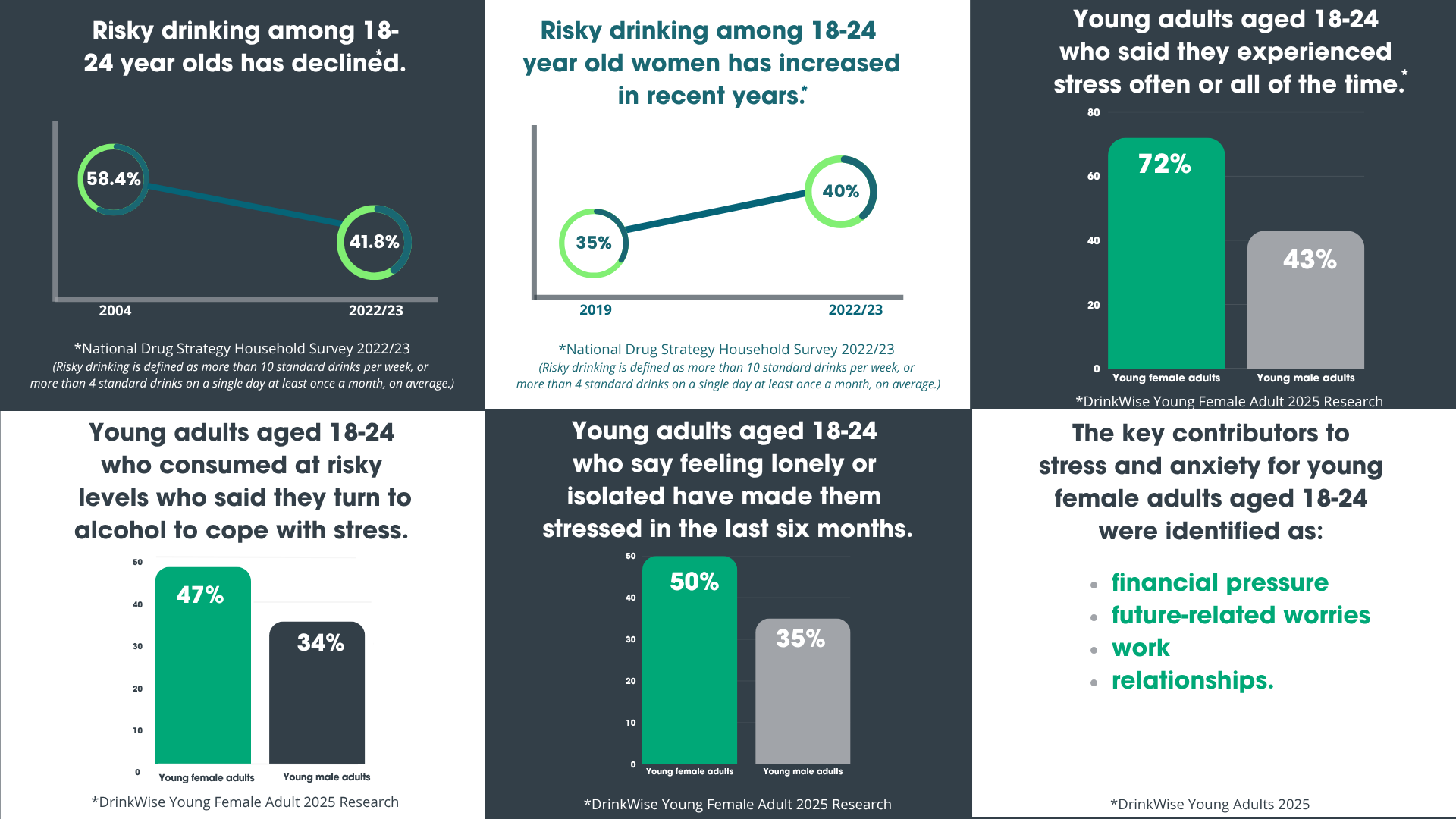 Young adulthood can be exciting, but it can also bring real pressure. Recent Australian Government research through the National Drug Strategy Household Survey showed that while risky drinking among young adults aged 18-24 has declined overall, rates among young women have increased in recent years. As an evidence-based organisation, DrinkWise commissioned research to better understand what was driving that shift. What emerged was clear – for some young Australians, particularly young women, stress and anxiety can build quietly and some are turning to alcohol as a way to cope.