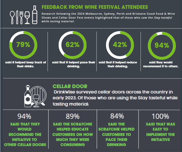Stay tasteful while tasting resource packs – including the innovative ‘scratchie cards’, signage and digital resources – were distributed to over 1,800 cellar doors and tourism associations across Australia as part of the initiative, with the assistance of regional winery associations. To help more people make responsible choices, wine festivals and events including the Good Food & Wine Show have also included the Stay tasteful while tasting initiative.